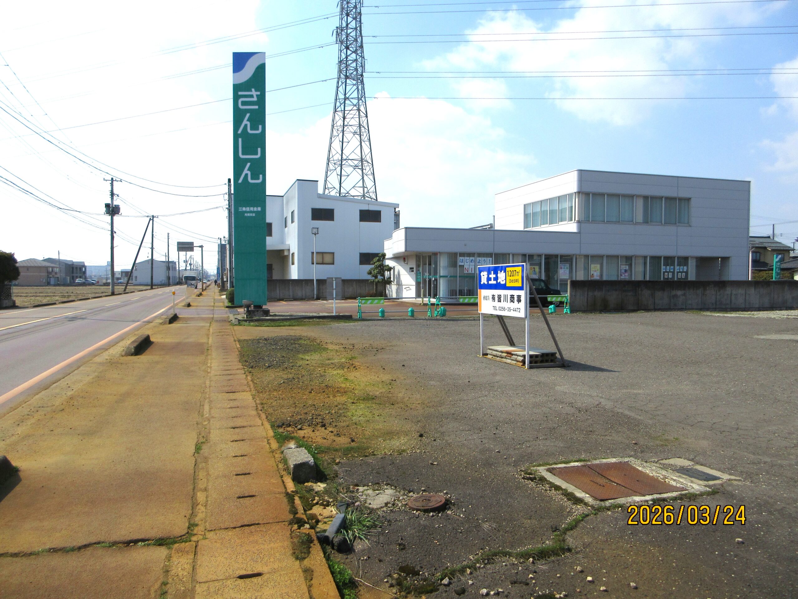 正面 南側から北側に向けて撮影 この物件(土地)の左隣に三条信用金庫月岡支店様がございます。